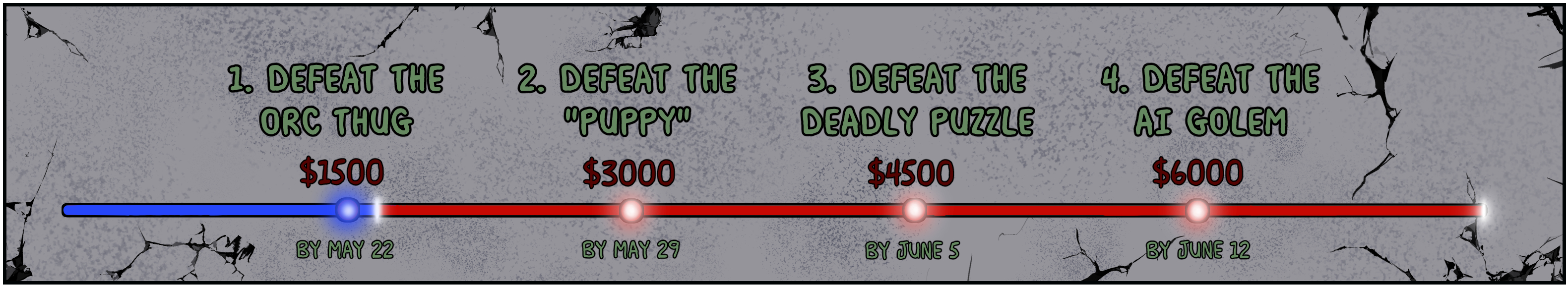 The fifth Tempts Fate page is live! Tempts has survived the first two challenges and now he enters The Deadly Puzzle! Will he survive? Well... yes. He totally will, because you have been so supportive and donated enough to ensure that he kicks butt on an epic level! The red bar below, shows the completed donation goals, and the blue bar shows how far over the goals you took him!