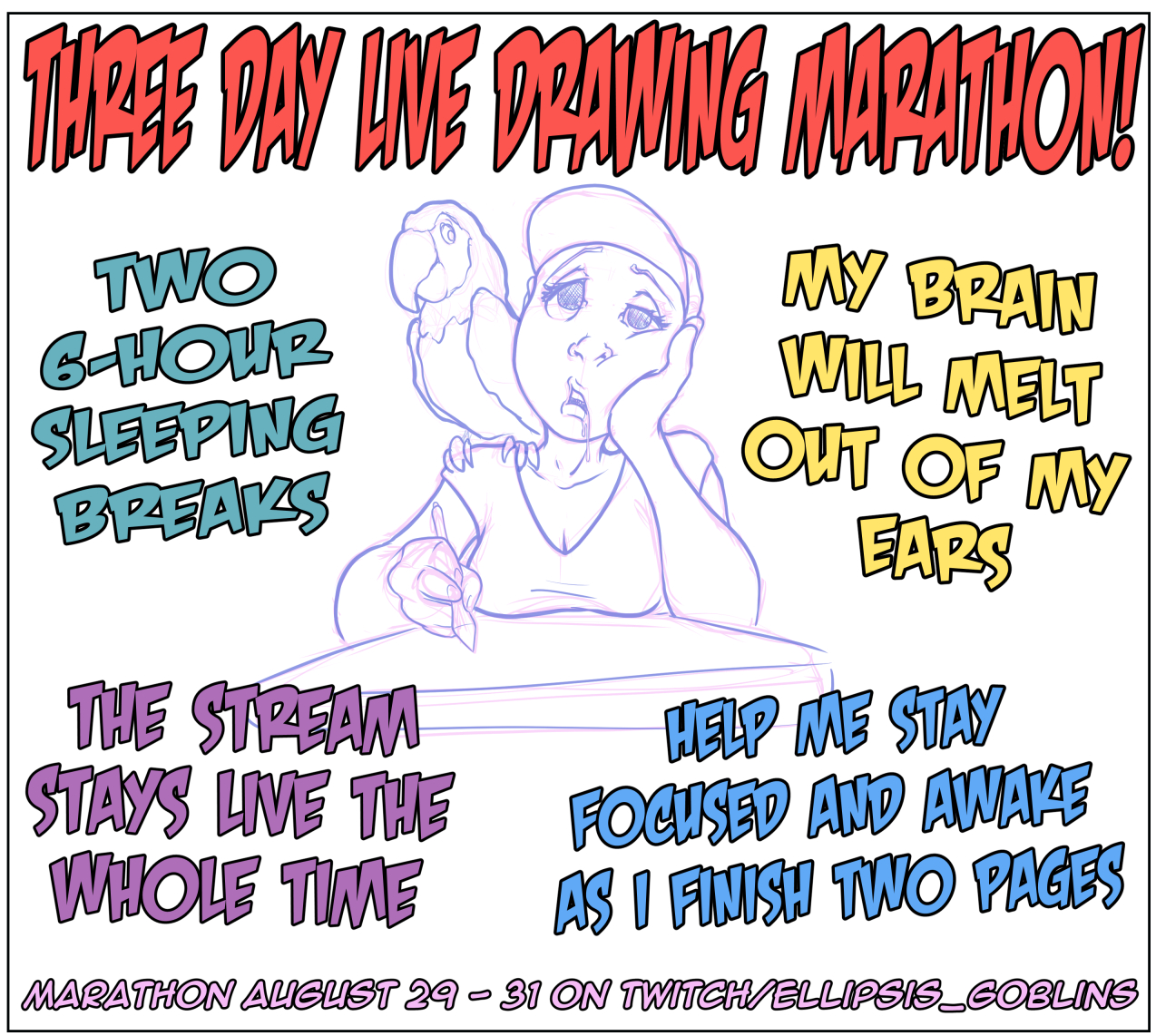 On the morning of Sunday, Sept 28th, we start the 3 DAY DRAWING MARATHON OF SLEEP DEPRIVATION! The goal is to get a super-human amount of work done and hopefully raise some money to keep my amazing wife in Canada.